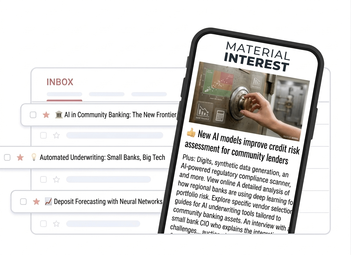 Material Interest exists to answer that question. We track AI adoption across regional and state-chartered banks - the tools gaining traction, the regulatory shifts that matter, the leadership moves shaping strategy, and the vendors worth watching. No hype. No billion-dollar budgets required.